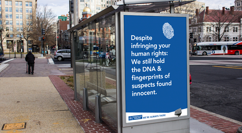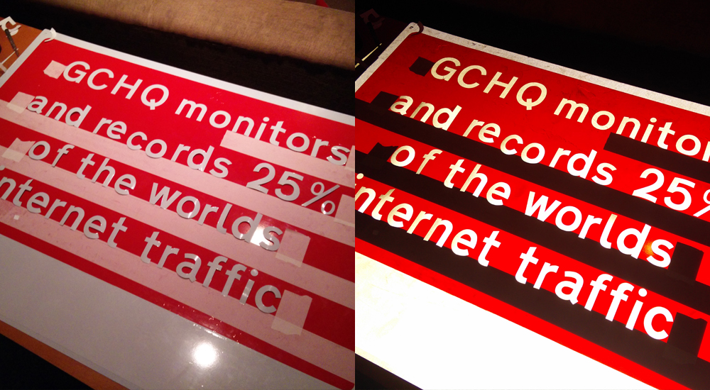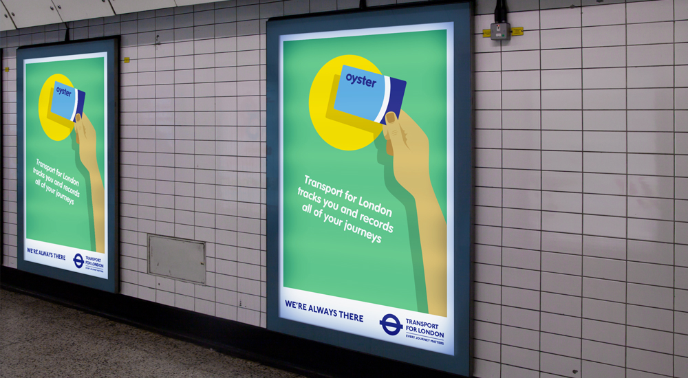 We’re Always There intervenes with the public, and aims to subvert these institutions. The campaign re-appropriates familiar visual language, and introduces factual statements detailing invasions of privacy. The reading of road signs and more generic looking posters is a relatively formulaic task, which serves to make the antagonistic statement less expected, and more impactful.